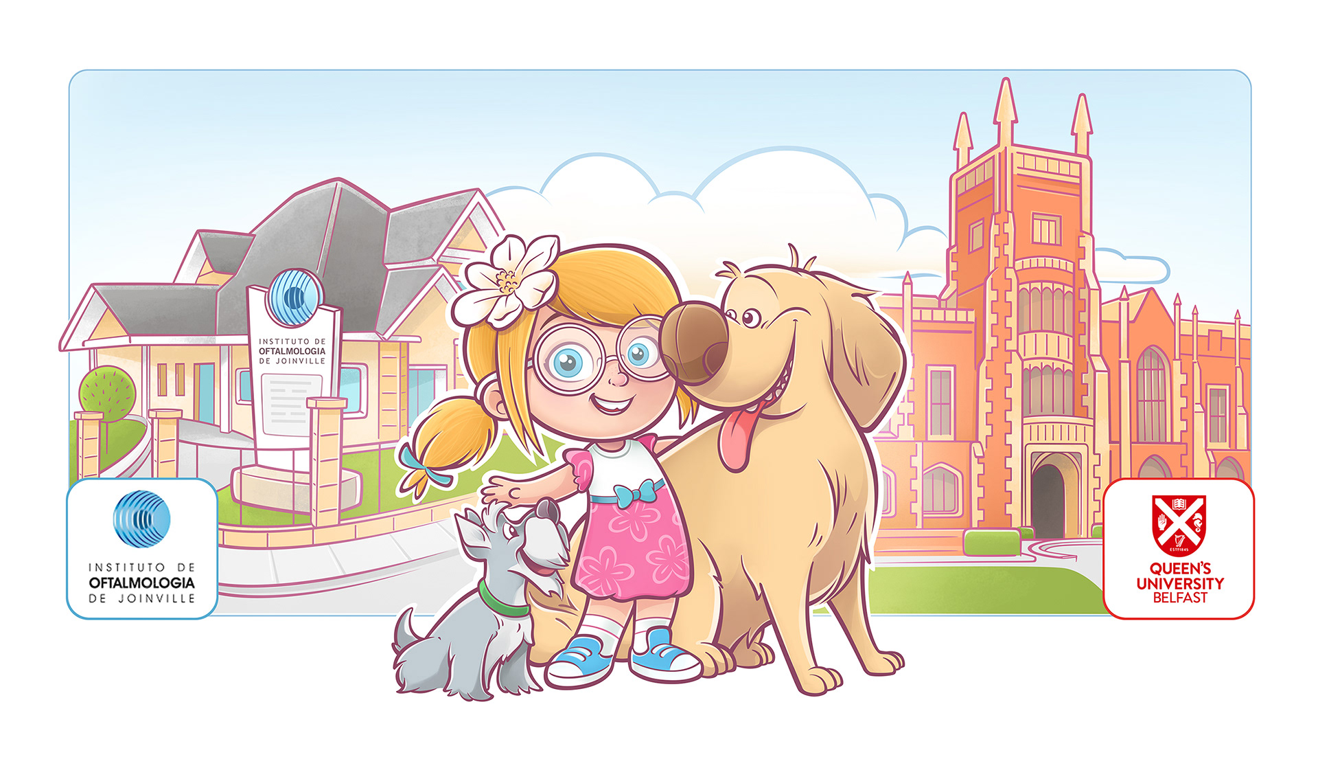 Criação de personagens para o Instituto de Oftalmologia de Joinville em parceria com Queen's University Belfast. A personagem principal é a menina Magnólia, que leva a flor em seu cabelo.