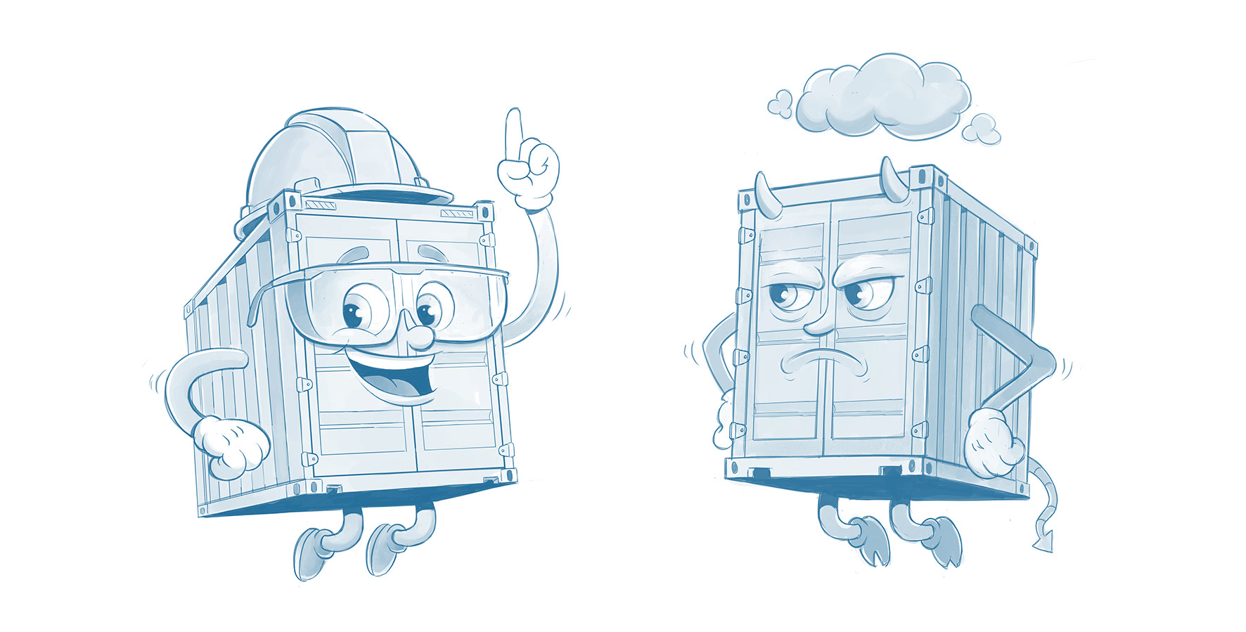 Personagens containers desenvolvidos para uso em diversas animações internas do Porto Itapoá. Os personagens tem diferentes personalidades.. o personagem verde fala sobre segurança e cuidado, já o personagem cinza é o nebuloso, preguiçoso e duvidoso.